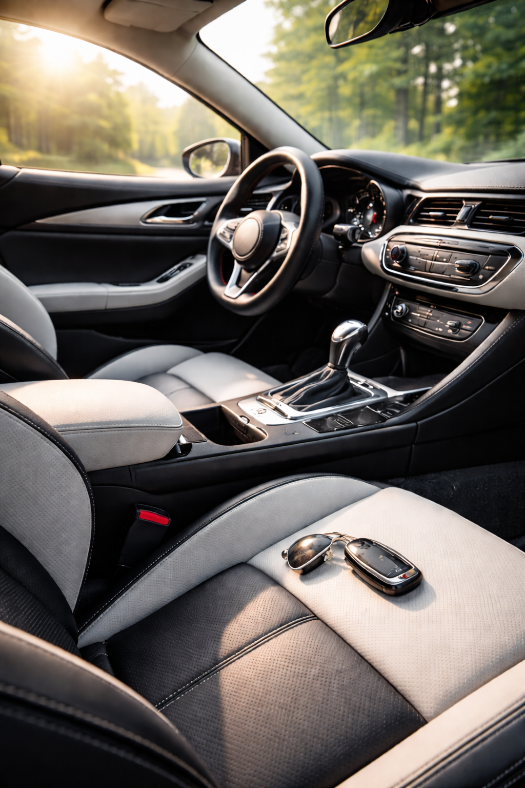 A freshly detailed interior with that unmistakable new car freshness—clean materials, cool air, and subtle depth.